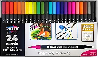 Stylos Fineliner & Stylos aquarelle (Duo Tip, lot de 24) – par Zieler® – Idéal pour le coloriage, le dessin et le lettrage à la main – 48 plumes – Couleurs vives – Encre lavable, à base d’eau